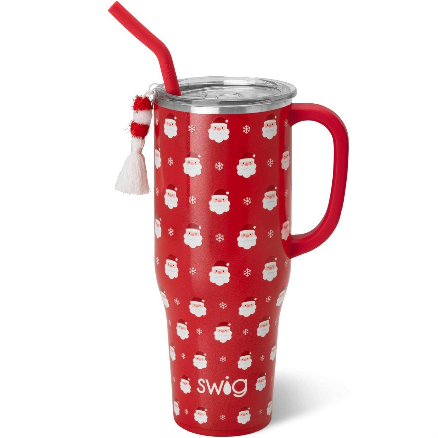 Mega sips, Mega chills! Santa Baby, slip a Swig under the tree filled with snowflakes and jolly faces over a festive red background.This design comes ready for gifting with our festive, tassel charm! Charm is to be removed before use and can be reused as a key, phone, or notebook charm. Hydrating has never been easier with our 40oz Mega Mug! The cup holder friendly frame, comfort-grip handle and flexi-tip straw with a standard, plastic straw base come together to create their new favorite Swig!