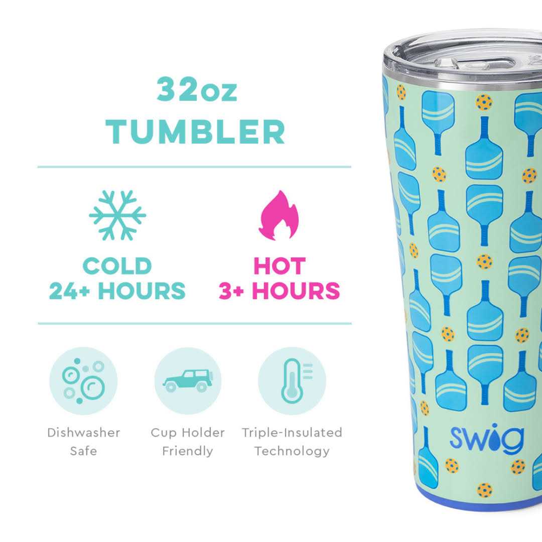 Bigger really is better! Grab a sideline sidekick with this playful pickleball paddle pattern made for refreshing in between rallies. Swig Life’s fan favorite 32oz Tumbler features a slim profile, making it cup holder friendly and comfy to hold–perfect for on the go sipping. The increased capacity means you get to enjoy more of your favorite drinks with fewer refills! From sweet tea to hot toddy’s, this Swig will definitely be your new fave.