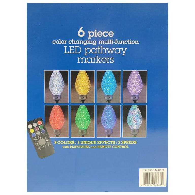 Dazzle your yard with the Sylvania 6pc Remote Controlled Color Changing pathway marker set. Select from 8 different colors and 5 unique effects. 10ft lighted length. Can connect up to 3 sets end-to-end. Features: Cord length 10′. Remote control or manual operation. Assembly required. For indoor and outdoor use. Lights ETL Listed