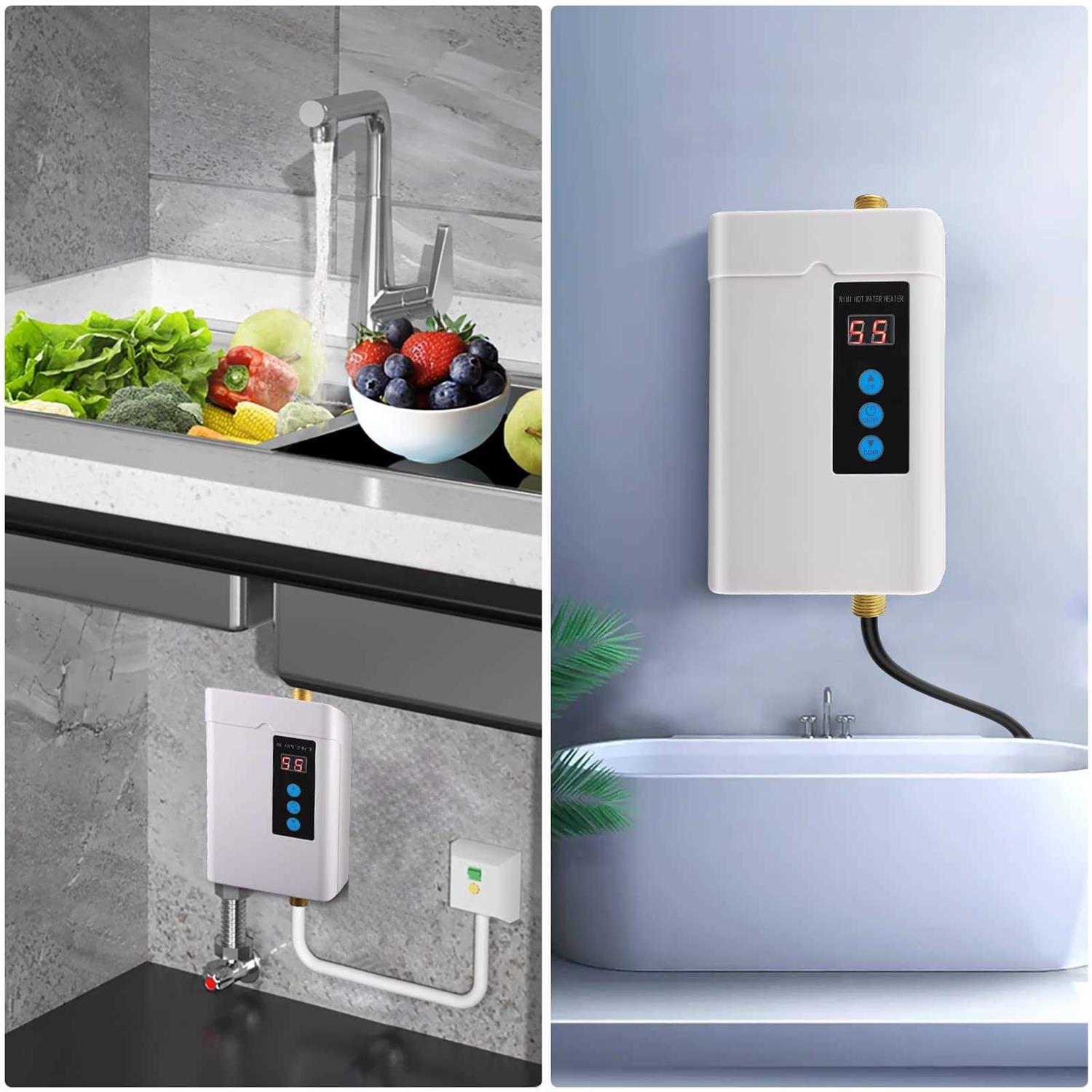 【INSTANT HEATING & CONSTANT TEMPERATURE】3000W high-efficiency output mini water heater, fast heating in 3 seconds, constant temperature to maintain the best water temperature for you.The water temperature can be adjusted freely with the water flow.( Adjustable temperature: 28°C-55°C) 【SAFE TO USE】Our domestic tankless electric water heaters have been rigorously tested and have multiple protection functions: water and electricity isolation, IPX4 waterproof, leakage protection, dry-burning protection, automatic power-off in over-temperature and inactive states. 【EASY TO INSTALL】The home water heater has a mini body, easy to install in the bathroom, kitchen, and under the sink.Standard 1/2 interface(inflow or outflow), can be directly connected to household conventional hose connectors.Notice:plug current: 27-32A, the trip switch is greater than 32A, circuit breaker within 4000W requires greater than C32, the wire within 4000W requires 2.5m². 【APPLICATION】Comfortable water temperature, suitable for washing food, bowls, clothes, face, hands, etc. (Only suitable for summer showers) 【HEALTH CARE】Washing hands and face frequently with hot water can effectively prevent various diseases such as colds and make the body healthier. It is an essential water heater for every family.