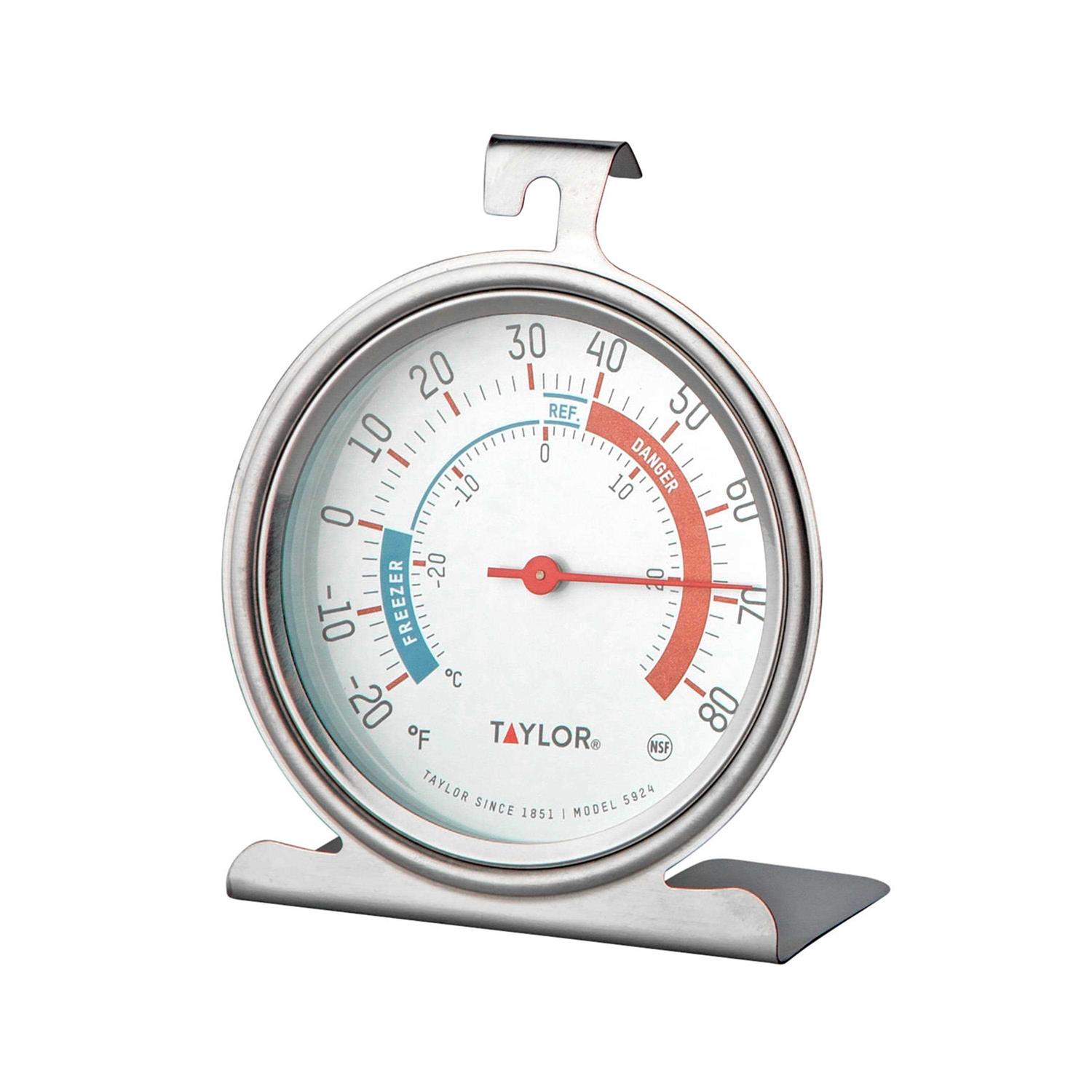 The extra-large, 3 1/4-inch dial features a glass lens and red pointer making it easy to read. This freezer/refrigerator thermometer has a range of -20degrees Fahrenheit to 80 degrees Fahrenheit. Colorful blue and yellow graphics with safe temperature zone indicators ensure your food is kept at the proper temperature range. The durable, stainless-steel casing provides strength and corrosion resistance. This unique design has the ability to either hang from a shelf or stand on its own. Keep your frozen and refrigerated items at the proper temperature with this freezer/refrigerator thermometer from Taylor. The extra-large, 3-1/4-inch dial features a glass lens and red pointer making it easy to read. This freezer/refrigerator thermometer has a range of -20degrees Fahrenheit to 80 degrees Fahrenheit. Colorful blue and yellow graphics with safe temperature zone indicators ensure your food is kept at the proper temperature range. The durable, stainless-steel casing provides strength and corrosion resistance. This unique design has the ability to either hang from a shelf or stand on its own.