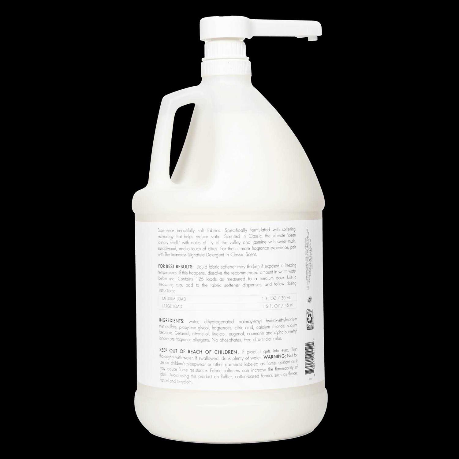 Liquid Fabric Softener by The Laundress New York. Details:For the first time ever, enjoy the Fabric Conditioner Classic you love in a new Gallon size for up to 126 washes per bottle. Soften and reduce static with The Laundress Fabric Conditioner Classic, our everyday conditioner for beautifully soft fabrics. Featuring an updated, lightweight texture that helps avoid messy dosing, this formula is designed to be the perfect complement to The Laundress detergents. Pair with our Laundry Measuring Cup for easy dosing (not included). Scented in Classic, the ultimate “clean laundry” smell with notes of lily of the valley and jasmine with sweet musk, sandalwood, and a touch of citrus.