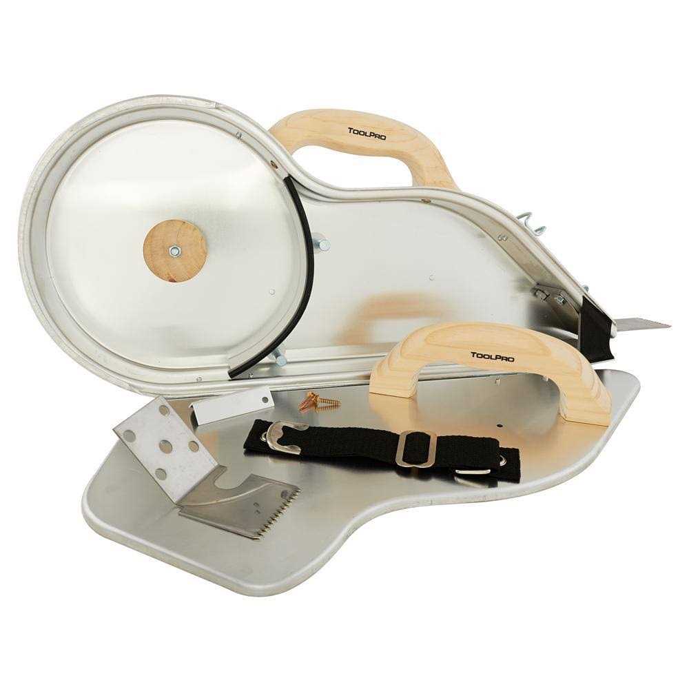 The ToolPro Dry Tape Drywall Banjo Taper applies drywall compound to drywall tape and increases speed over traditional drywall hand taping. The banjo taper holds up to a 500 ft. roll of tape and strings 40 ft. per load. The aluminum construction is sturdy and light-weight. The lid is beveled inward to create a leak-proof metal-to-metal seal. The dry tape banjo gets its name from having the roll of drywall tape separated from the wet drywall compound – keeping the roll dry and only applies mud to the tape lead.