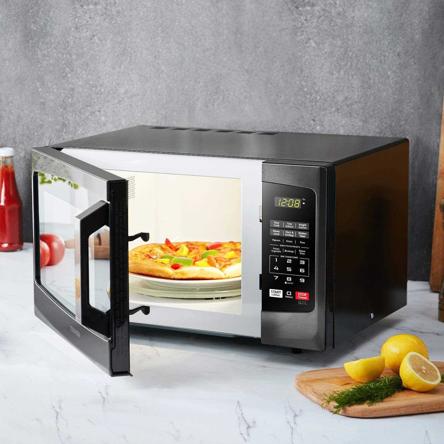 Microwave Oven with Eco Mode – Convenience and Durability The Toshiba black stainless steel microwave oven helps you stay well-fed even when you have little time to spare. Offering 10 power levels with a power of 900W this microwave with a clear digital display and LED interior lighting makes light of quick cooking. One-touch buttons and 6 pre-programmed settings simplify operation. The audio signal at the end of the cooking cycle can be softened in case you find it too loud. With a black stainless steel exterior this appliance looks good in any kitchen.