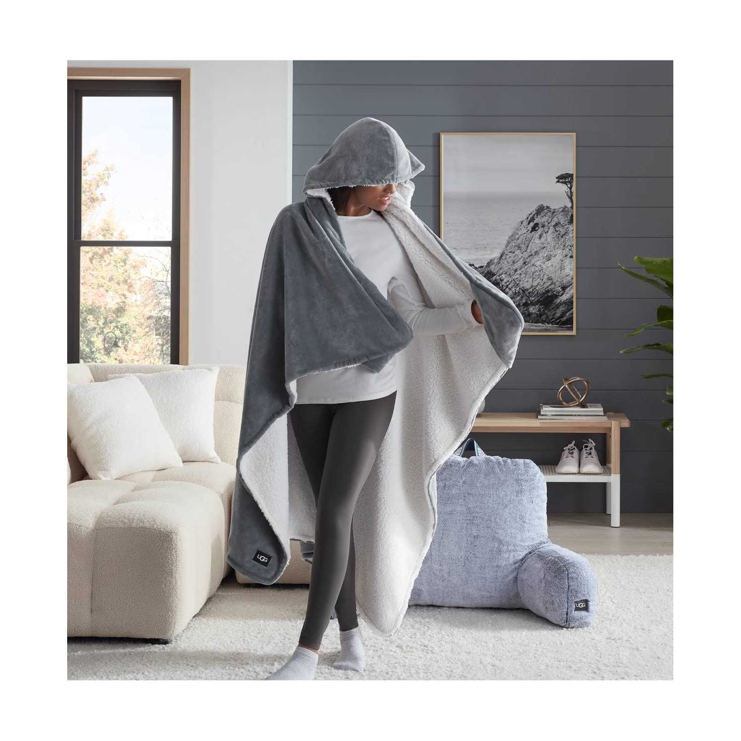 Stay warm and cozy on chilling evenings with the Avery Hooded Throw from Ugg, featuring a soft flannel exterior that reverses to a fluffy finish. Style Keywords: Reversible,Solid,Dark,Children,Polyester,Minimalist,Light,Flannel,Neutral,Winter,Soft Plush Fabric,Throw