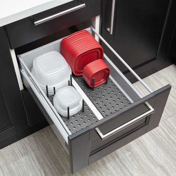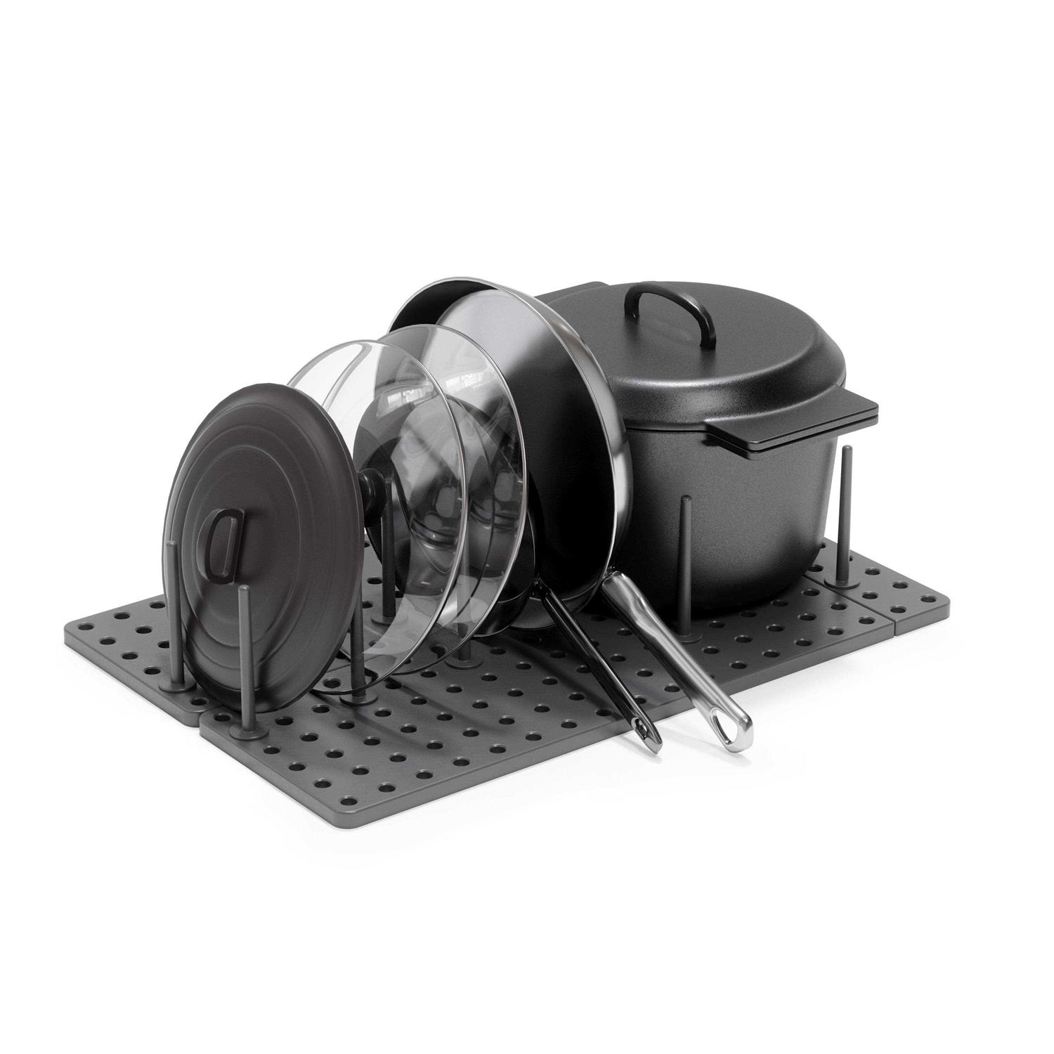 What makes Peggy unique is the adjustable tray and removable pegs that can be repositioned at any time. You choose where to place them based on your needs which means you can create the perfect fit to accommodate your plastic food storage containers and lids, your cookware including pots, pans and lids, your mixing bowls, your cooking utensils and just about anything else you want to keep organized and in its place. Comes as a set of 2, place the bases side by side, use them separately or even combine multiple sets to accommodate larger drawers, cupboards and cabinets. With a matrix of 108 holes and a total of 32 pegs included, there’s literally hundreds of available configurations which means nearly limitless storage possibilities. To ensure a perfect fit, each base can be extended up to an additional 3.25 inches and comes equipped with non-slip feet to ensure Peggy stays put.