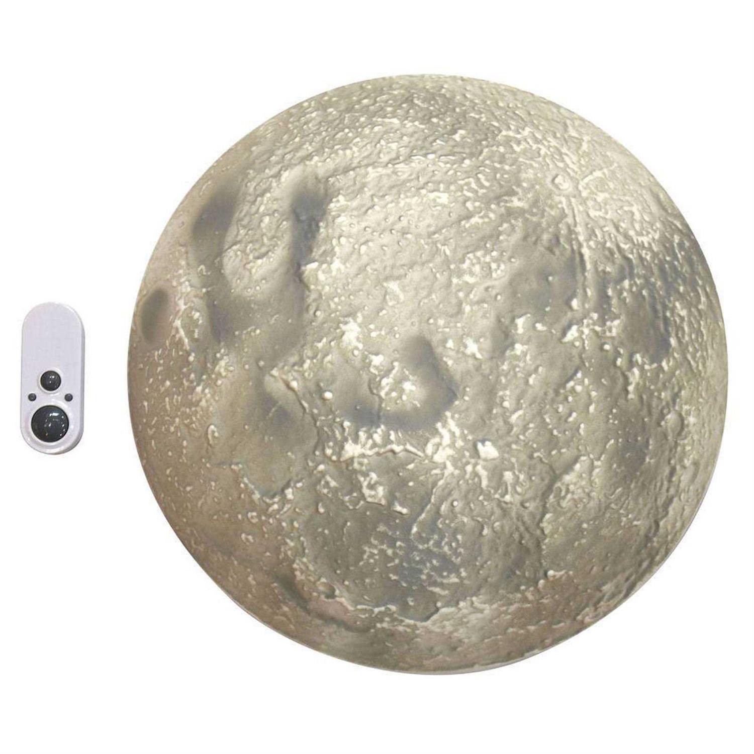 Bring the moon into your own room. The authentic moonscape shines moonlight just like the real moon. The remote controlled moon automatically scrolls through twelve illuminated lunar phases. Manual function allows you to set your own moon to look just like the moon outside. Detailed moon makes stunning room accessory or reassuring night light. Easy to hang on your wall – just like a picture. Auto shut-off saves battery life. Read fascinating information about the moon in the colourful educational booklet.