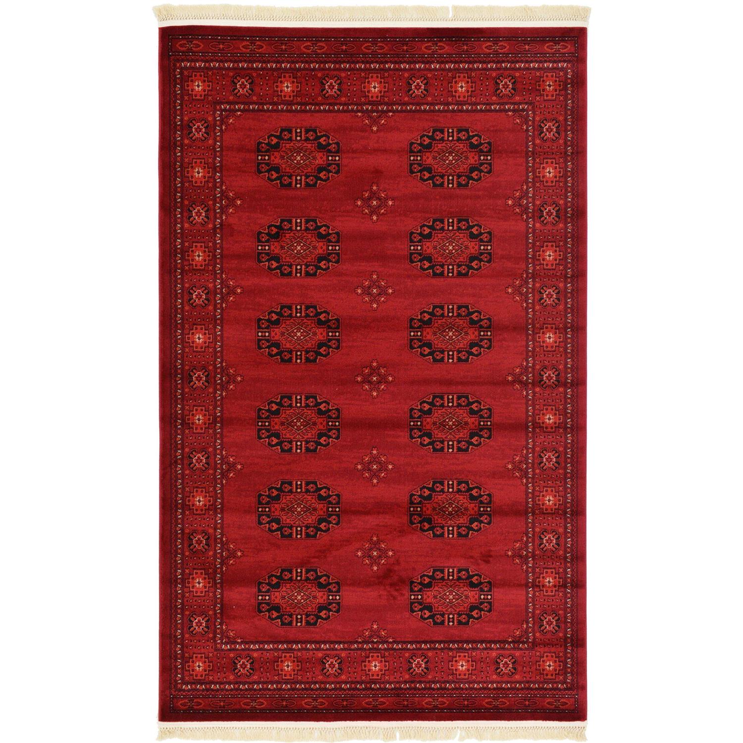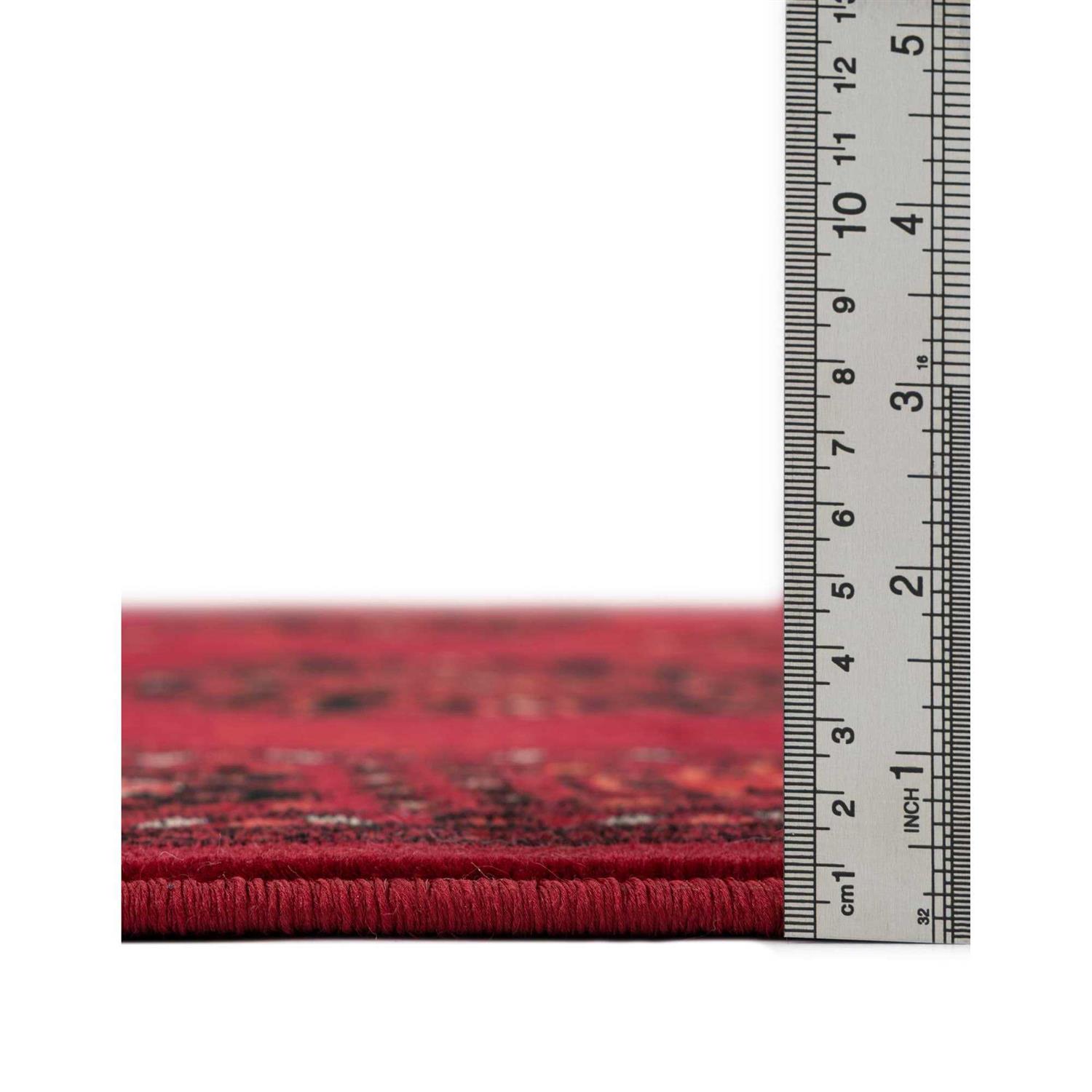 This Turkish Bokhara rug is made of Polypropylene. This rug is easy-to-clean, stain resistant, and does not shed. Colors found in this rug include: Red, Black, Cream, Terracotta. The primary color is Red. This rug is 1/2″ thick.