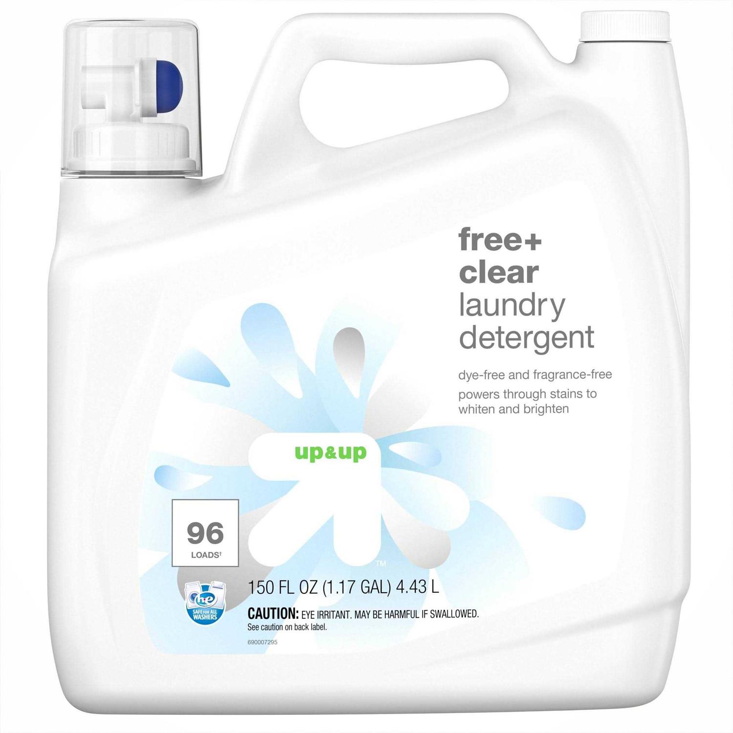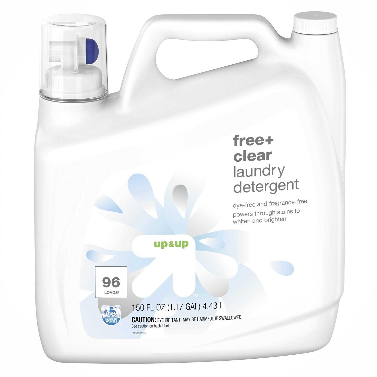 Keep your laundry fresh, clean and good for your skin with the up and up Free + Clear liquid laundry detergent. This dye- and perfume-free laundry detergent is gentle on your family’s skin while being tough on stains, dirt and grime, leaving your clothes brighter and whiter than before. This unscented laundry detergent is great for sensitve skin. This package includes one 150-ounce bottle of up and up Free + Clear liquid laundry detergent, enough for 96 wash loads. Packaging contains recycled content- bottle made from 25percent recycled plastic Size: 150 fl oz.