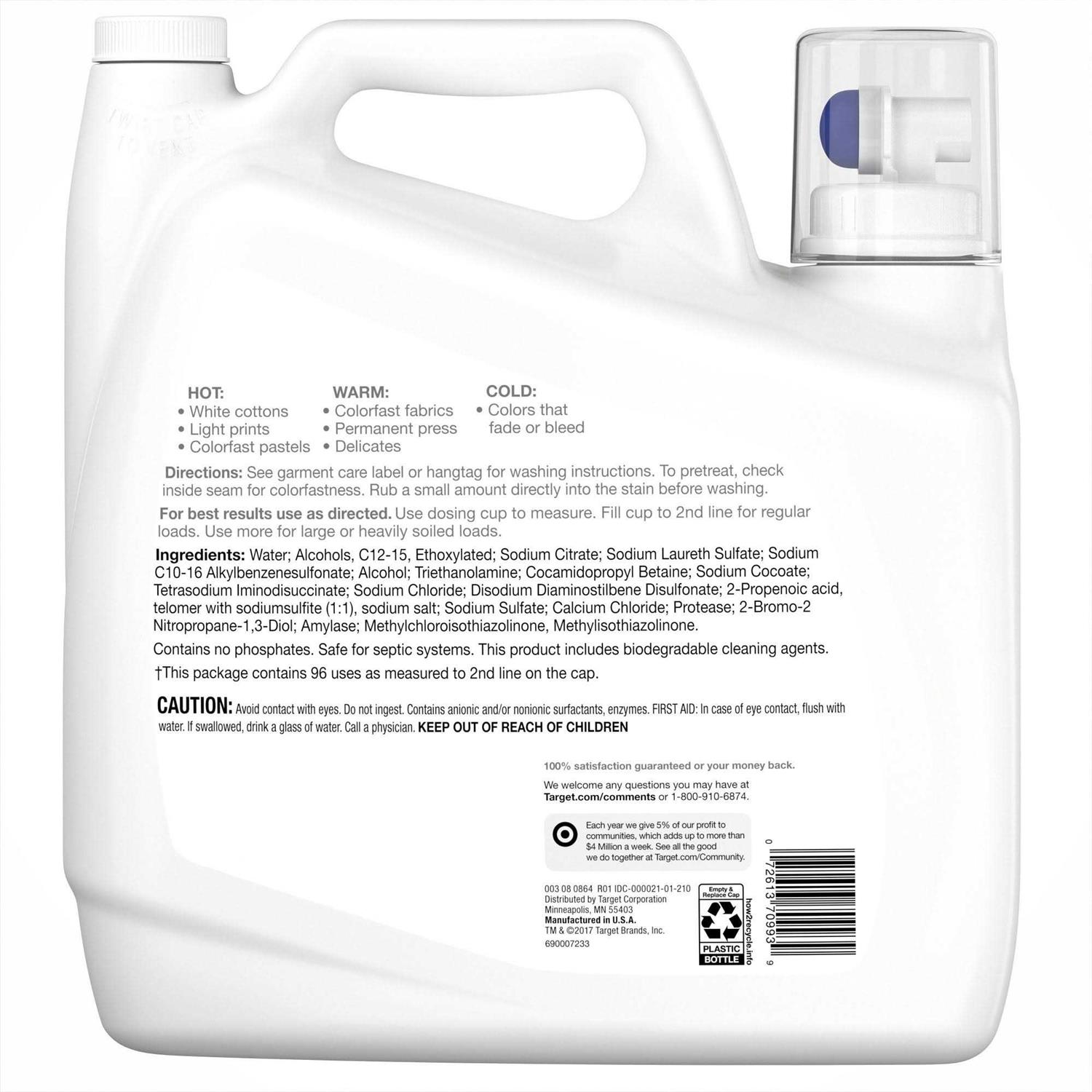 - Clear liquid laundry detergent, enough for 96 wash loads.