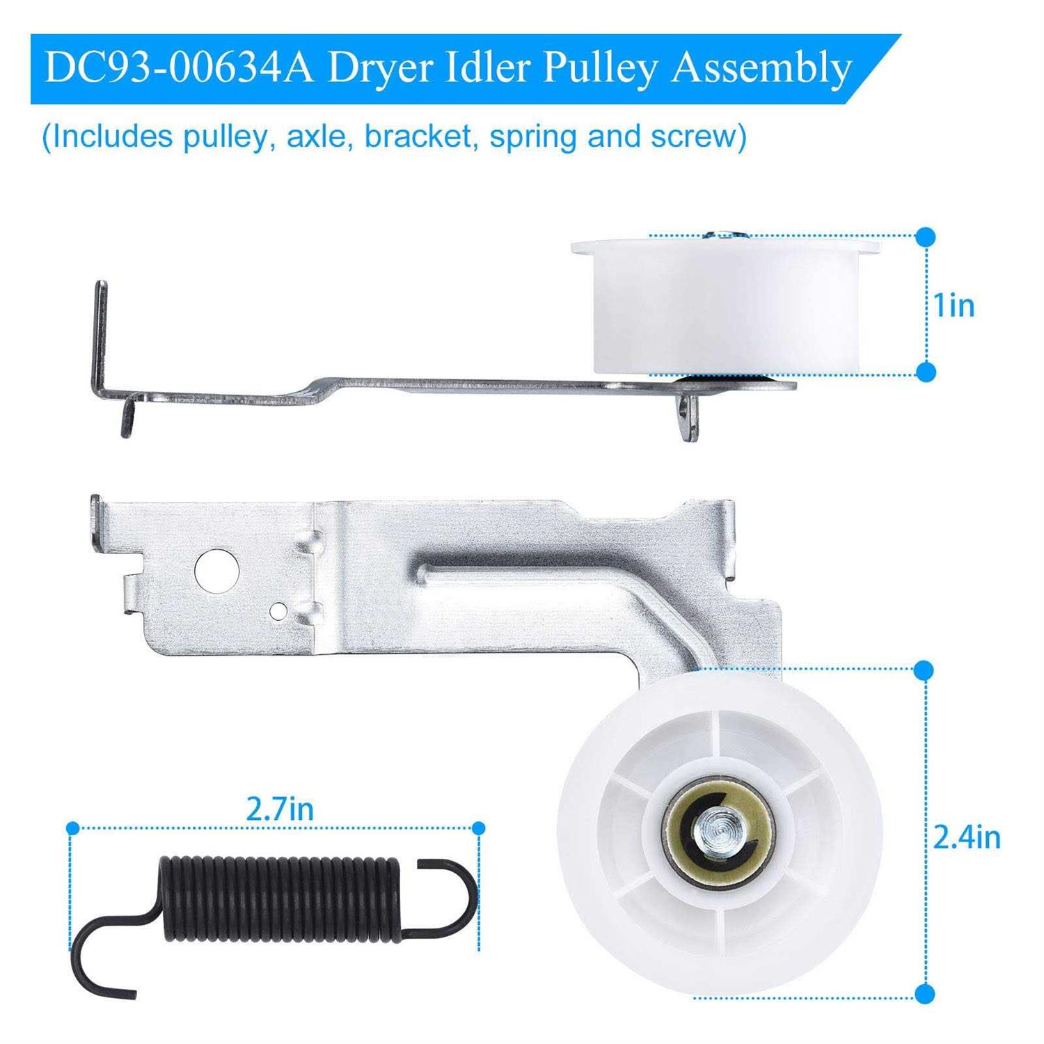 Dryer Repair Kit Includes DC97-16782A Drum Roller 6602-001655 Drum Drive Belt and DC93-00634A Idler Pulley Assembly Compatible with Samsung Dryers 【PACKAGE INCLUDESã€? 4 pcs DC97-16782A dryer drum roller (includes roller wheel and roller axle), 6602-001655 dryer drum drive belt, and 1 pc DC93-00634A dryer idler pulley assembly 【PERFECT REPLACEMENTã€? â‘? DC97-16782A Drum Roller Replaces DC97-07523A, DC97-07523B, 2027851, AP5325135, PS4221885, EAP4221885. â‘? 6602-001655 dryer drum drive belt replaces 5PH2337, 6602-001314, 1935594, AP4373659, PS2407938, EAP2407938. 3DC93-00634A idler pulley assembly dryers replaces DC96-00882B, DC96-00882C, DC97-07509B, 4455850, AP6038887, PS11771601, EAP1177160. And compatible with Samsung dryers 【HIGH QUALITYã€? Dryer replacement part kit are made from durable high-quality material, which well-tested by the manufacturer and meets OEM standards 【EASY REPAIRã€? This dryer replacement part kit easy to fixes many dryer problems such as dryer is noisy, will not tumble, leaves marks on clothes, or will not start etc. Easy to install, saves your time and money from expensive repairs ã€? 0 DAYS REPLACEMENT OR FULL REFUND PROMISEã€? Don’t hesitate to solve your dryer problems easily!