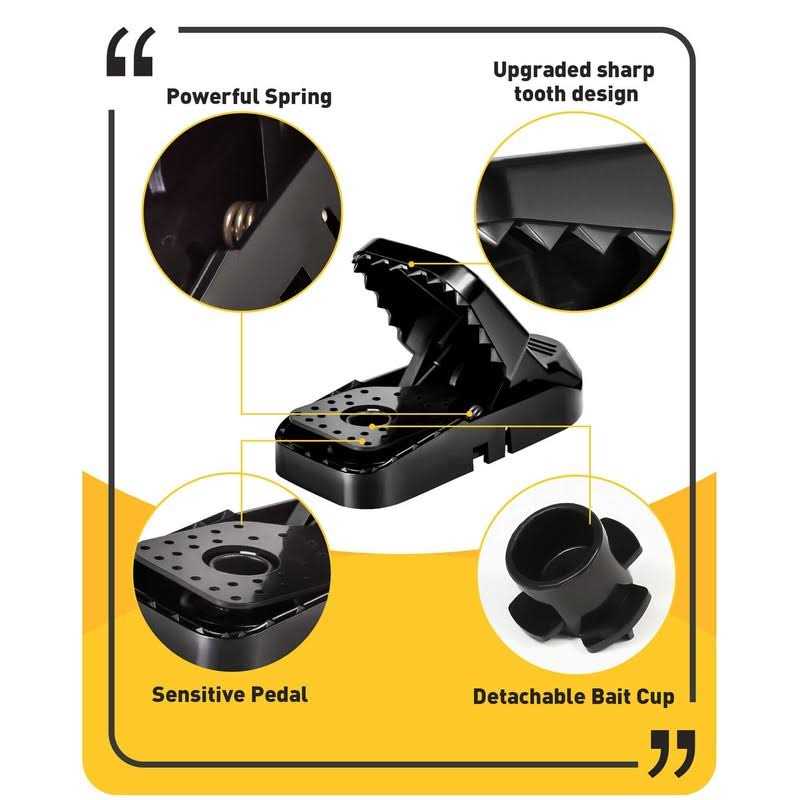 【Reusable & Durable】These mouse traps indoor are made of high-quality ABS plastic, which is easy to wash and reusable, does not absorb any odor or stains like the traditional wood mouse traps. 【High Sensitivity & Quick Kill】Powerful springs and large open mouths design make them catch and kill rats instantly, only 0.03lbs of weight can trigger the trap and ensure the mouse be killed faster without any pain. Suitable to catch small mice. 【Easy to Set Up】Just take out the bait cup, put food into it and put back to the mouse trap, keep the trap clamp open, then place the mousetrap where mice would normally be and waiting. Suggest to use small amount peanut butter as bait. 【Safe to Use】No touch design, avoiding any possible injury to your fingers. You can place them around the house safety without the worry of cross-contamination or foul odors. When disposing the rat, just press to let it go without ever having to touch it. 【Applications】Our trap