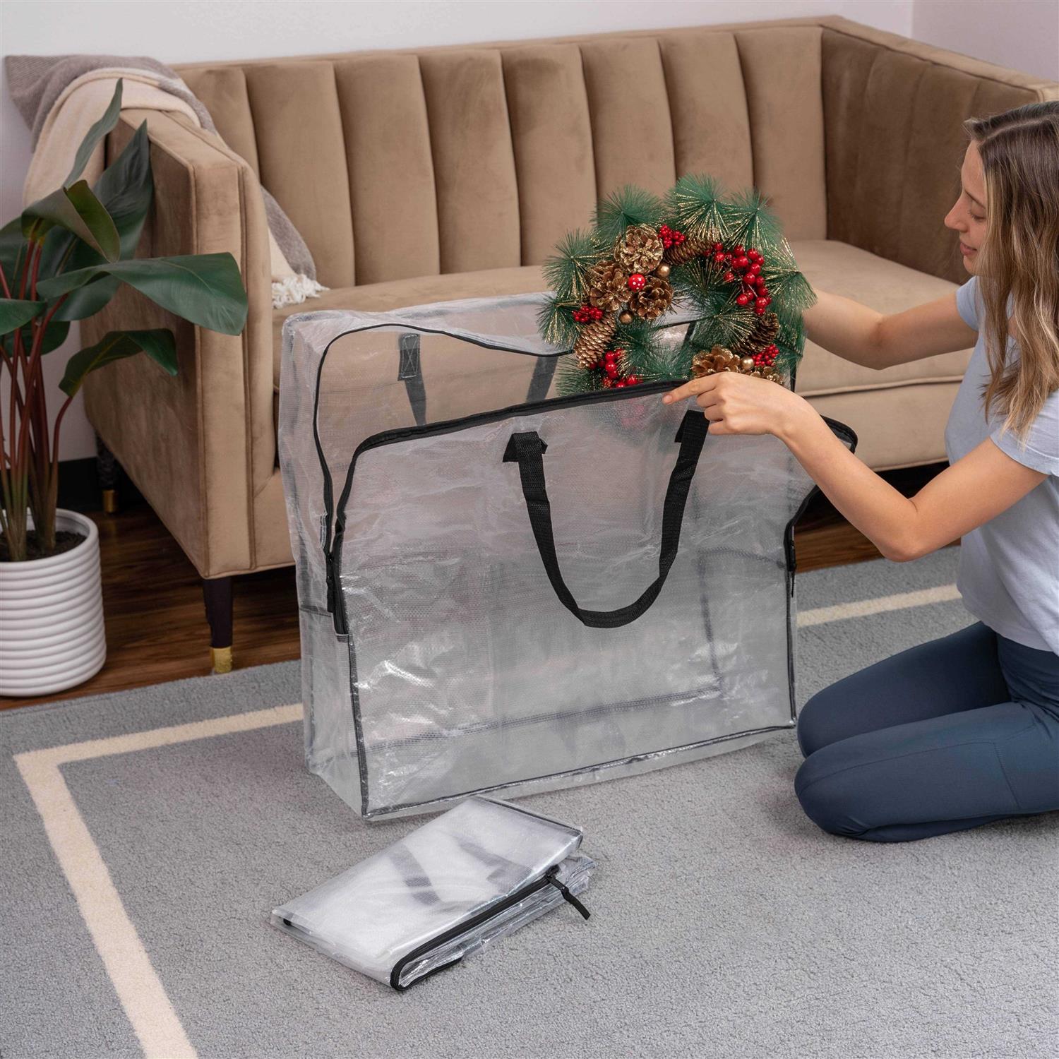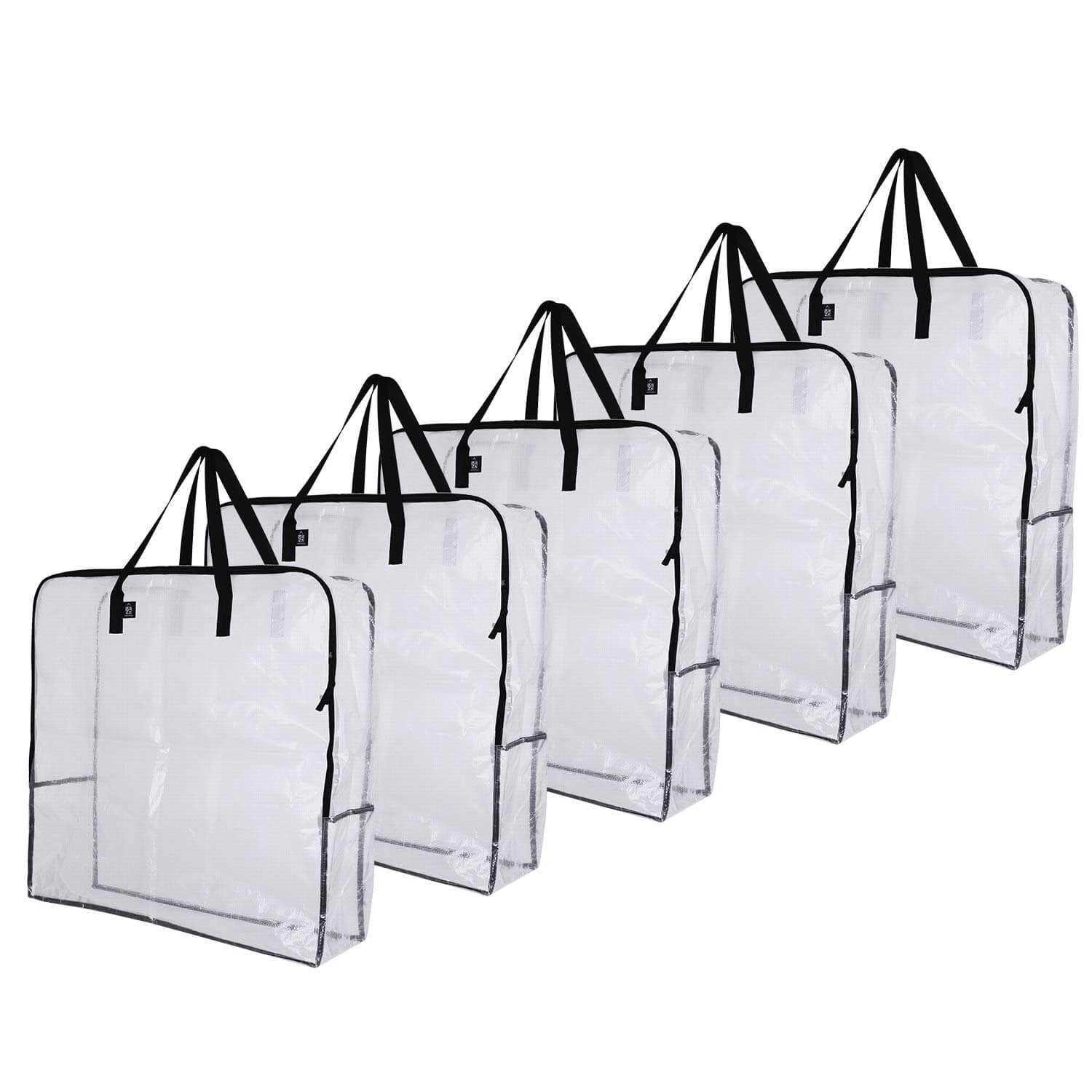 EXTRA-LARGE: 25.6″ L X 25.6″ H X 8.7″ D – 25 Gallon volume. Super large capacity and spacious tote bag can store many items such as Christmas wreaths, cushions, camping gear, stuffed animals, party supplies, home décor, holiday decorations, tires, wheels, sports equipment, strollers, frames, sleeping bags, foldable bicycles, bedding, pillows, clothes, comforters, blankets, sheets, linens, towels, quilts, shoes, purses, laundry, and more. SEE-THROUGH DESIGN: Clear, transparent design lets you easily view stored contents for quick identification without needing to search or open the bag. Made of sustainable, water-resistant, high-grade, durable premium polypropylene woven fabric material that is built to last. Thick, tear-resistant, and puncture-resistant material keeps your items safe from moisture, dust, dirt, and humidity. A minimalist’s choice for storage solutions. Easy to clean with wipes. HEAVY-DUTY & DURABLE: Stands upright and can safely hold up to 50 lbs. Heavy-duty handles are reinforced with 3 layers and cross-stitched to increase strength and load bearing capacity. The long, strong, and thick poly webbing carrying handles conveniently allow for easy carrying, ability to be hung on a wall, and easy pulling and sliding from under your bed. A sturdy, smooth, dual tab 3-sided premium zipper goes down the edges allowing the bag to open wide for easy loading and unpacking. MULTI-FUNCTIONAL: Essential for storing, moving, transporting, camping, organization, space saving, and travel. Great to use and store in the garage, closet, cabinet, basement, attic, and under your bed. Perfect for storing Christmas wreaths and decorations, transporting clothes and bedding when moving into your apartment or dorm, keeping outdoor cushions clean during harsh weather or in between parties, bringing blankets or gear for your camping trip, and hanging sports equipment in the garage. STORAGE BIN & MOVING BOX ALTERNATIVE: A lightweight, economical, and convenient alternative to storage bins and moving boxes. Less bulky, easier to carry and move, and easier to see contents inside. No extra packing supplies are needed, just unfold, unzip, and begin packing or loading. Stackable and can be hung to save room space. Collapsible and foldable when not in use for easy compact storage in your closet, drawer, cabinet, car, or garage.