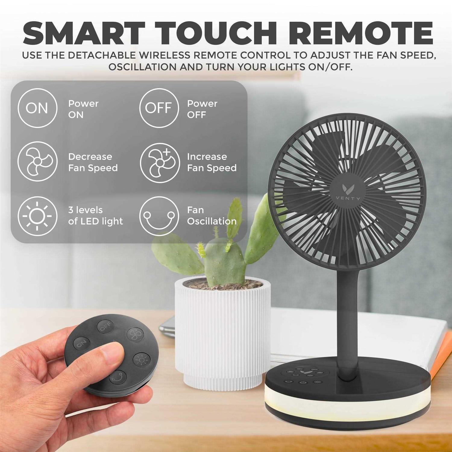 - Ultra quiet Cordless Battery Operated with Remote Control Fully Oscillating LED 3 Setting Ambiance Glow Folds to 3.
