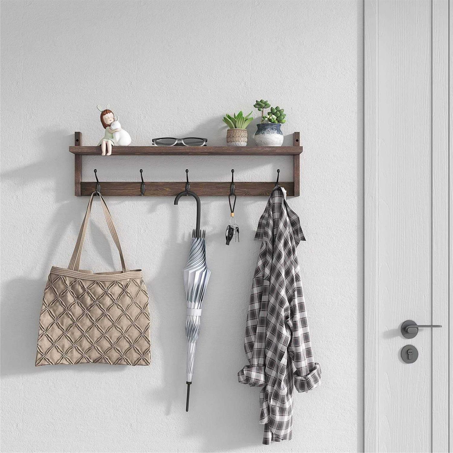 Vertorgan Coat Wall Hooks with Shelf, Wood Coat Rack, Wall-mounted, 25.6 inch Entryway Shelf with 5 Hooks (Brown)