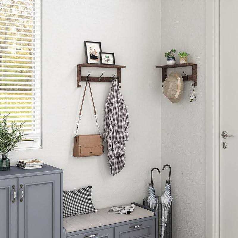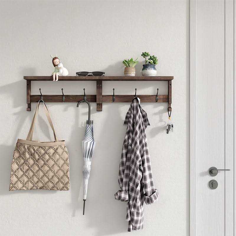 Create Wall Storage Aesthetics If you want to make your walls more beautiful, try the VERTORGAN coat hooks. The vintage brown solid wood collides with black metal hooks, perfectly blend rustic and modern styles to fit any design style of your room. Build a Solid Structure The wall hooks are fixed on both sides with standing boards to form a solid T-shaped structure. Harvest More Storage Space The VERTORGAN coat rack wall mount can hang items as well as place things. The top shelf is suitable for photo frames, decorations, plants, etc. Unlock Different Storage Scenery The coat rack wall mounted can be installed in your entrance, bedroom, kitchen or patio, etc. You can not only display plants, photo frames and accessories, but also store keys, umbrellas, school bags, hats, coats and more, making your space simple and organized. Have Fun with DIY Easy to assemble! Clear instructions and accessories Yes! Pre-drilled holes Yes! You can find all you need in the package. Let’s have fun DIY with your family!