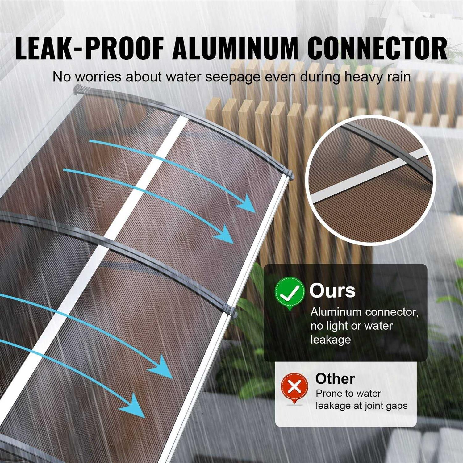 Stay Cool & Protected – This awning for doors offers UPF 50+ sun protection, shielding you from harmful UV rays and keeping your home cool during hot summer days. Easy Installation – Our detailed instructions and clear images make installation a breeze. In addition, our window & door awnings exterior are designed for hassle-free joining, so you can customize your outdoor space with ease. Durable & Versatile – Our polycarbonate awning is made of a 6mm thick PC sunshade panel, resistant to extreme temperatures and corrosion, making it perfect for both residential and commercial use. Moreover, its sleek design and versatile colors complement any home or outdoor decor. Seamless Joint Design – Our window door awning canopy upgraded assembly design features tightly sealed aluminum joints, ensuring sufficient sealing and preventing water from seeping through even during heavy rain. Enjoy the rain scenery without getting wet! High-Quality Assurance – This door awning is made of transparent PC panels, ABS brackets, and aluminum alloy installation bars. The PC panels offer excellent transparency, temperature resistance, and durability. The high-strength ABS brackets remain intact without deformation. The aluminum alloy installation bars ensure a secure and watertight installation, withstanding strong winds and storms, providing long-lasting quality protection for your windows and doors.
