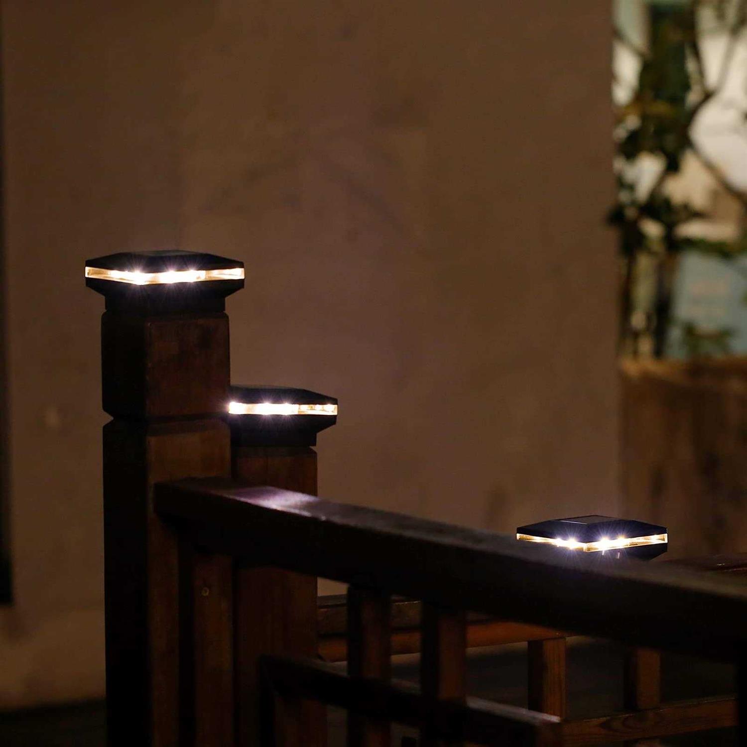 Auto Solar Post Caps: Add an elegant touch to your outdoor spaces with VIEWSUN classic solar powered post lights. Featurs 8 high output surface mount LEDs. Equipped with 15 lumens LED bulbs, they will cast a rich ambient light that will Automatically light up at dusk creating a picturesque landscape for your fence, porch or deck. High Performance Solar Lights: Manufactured from durable, vinyl (PVC) the post lights will not fade, crack. Each cap offers a monocrystalline solar panel and 1.2V 1000mAh rechargeable NI-MH battery battery stays lit for up to 8 hours after charged in the daytime for 6-8 hours under the sun, and for many years of maintenance-free reliability. Weather Proof: Perfect for outdoor use, these solar post caps are designed to live outdoors with weather-resistant materials that don’t mind UV light beaming down or rainstorms rolling through. Quick & Easy Do-It-Yourself Installation: The fence post solar lights require No electrical wiring for installation. Comes with 2 sizes of mounting kit for posts, simply screw the deck post lights into highest point on the railing. Easily mount on top of any 4 x 4, 5 x 5 or 6 x 6 inch wooden post. (Note: Just for 5×5 wood post, the light’s square footprint leaves the post corners slightly exposed.)
