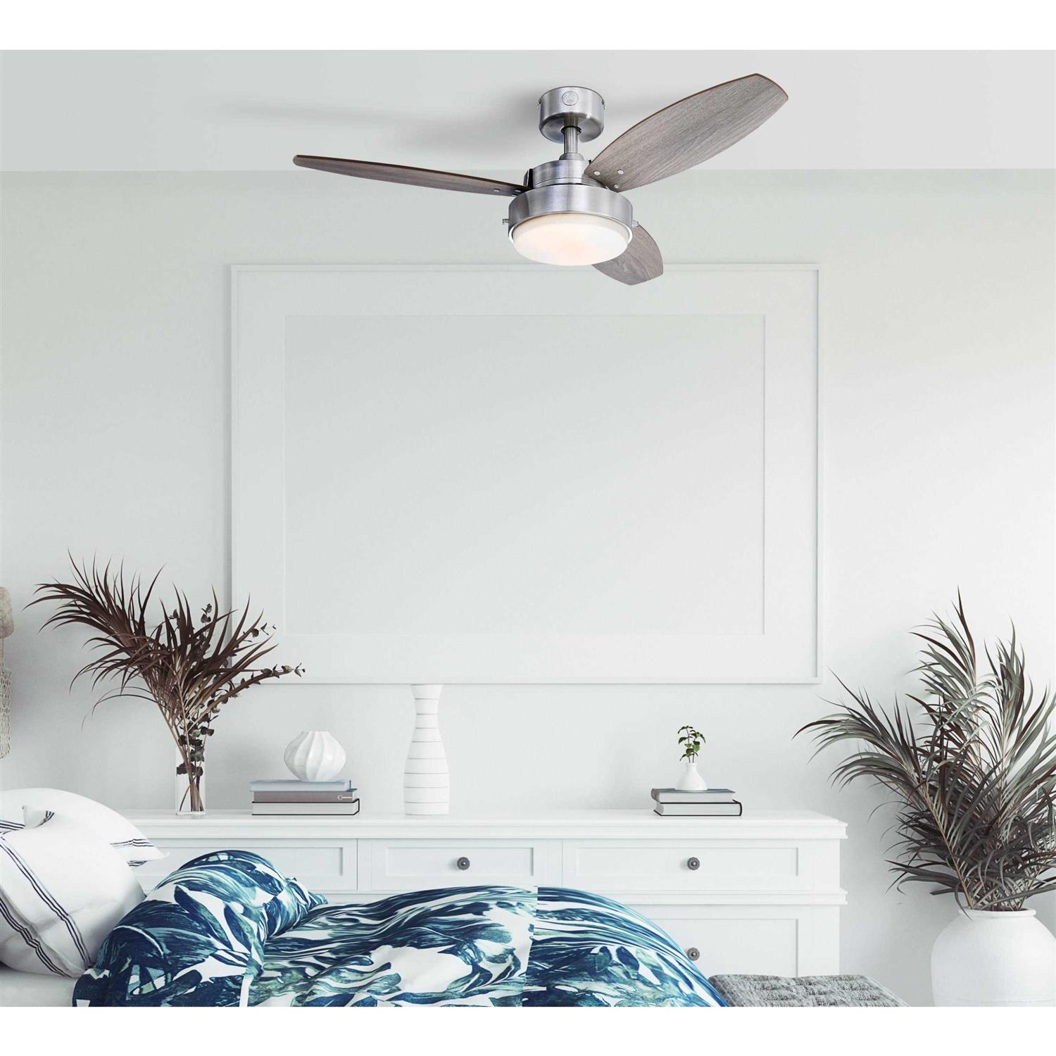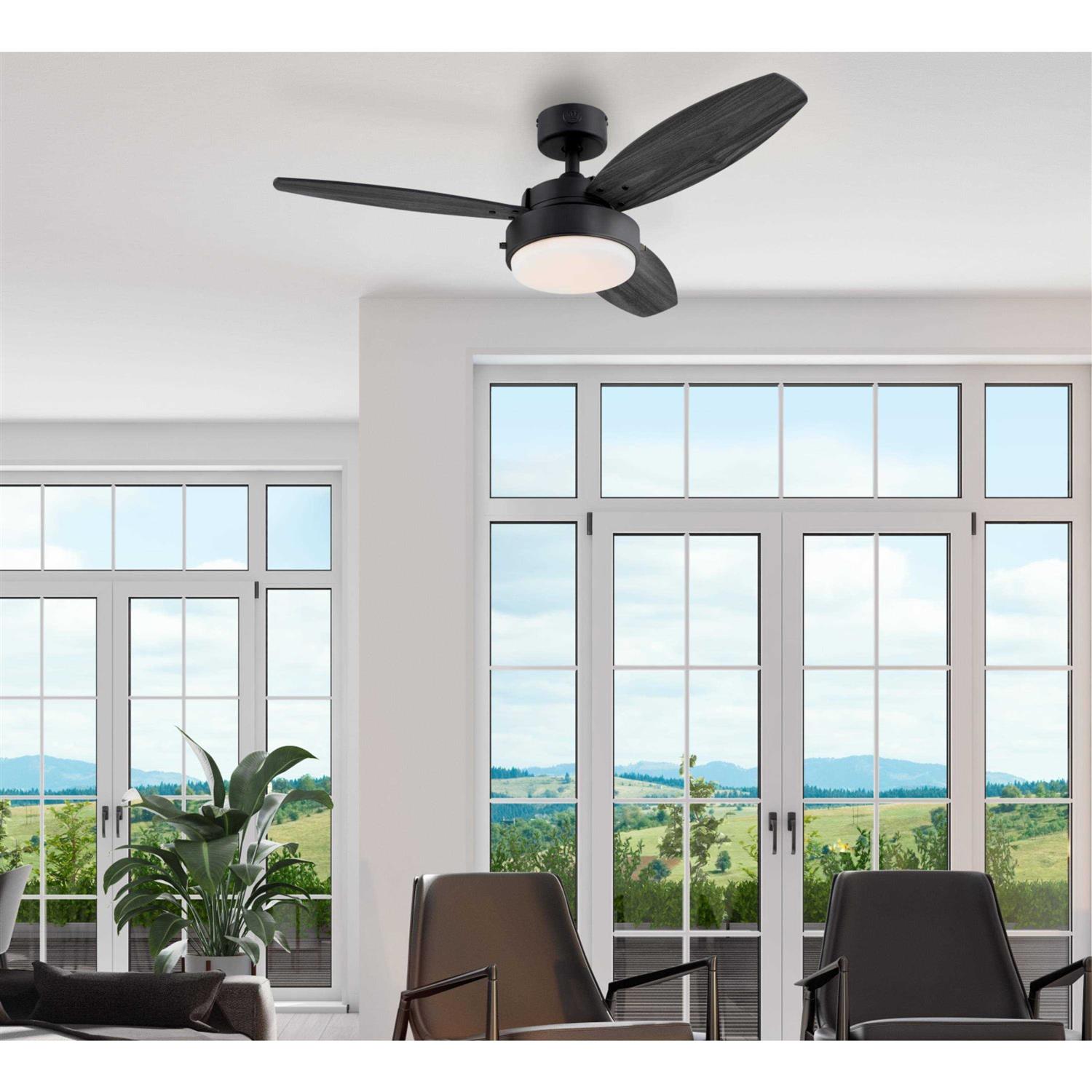 Introducing the 7305000 Westinghouse Alloy Ceiling fan, a modern propeller ceiling fan that combines functionality and style. This 42-inch ceiling fan is the perfect addition to any indoor space, its matte black finish adding a touch of elegance. The 7305000 Alloy ceiling fan offers a versatile lighting and cooling solution. It includes two LED bulbs and opal frosted glass, ensuring both illumination and ambiance. Additionally, this fan features a reversible motor and reversible blades with a charcoal/riverbed finish, allowing you to tailor its appearance to your liking. When operated at its highest setting, this fan consumes a maximum of 53 watts while delivering a robust airflow of 2897 cfm. This ceiling fan is easy to control with a pull chain mechanism for both speed and light adjustments. It offers three-speed settings to suit your comfort needs, making it suitable for kitchens and home offices. It’s also compatible with sloped ceilings up to 30 degrees, providing versatility for different spaces. Upgrade your living area with the 7305000 Westinghouse Alloy Ceiling Fan, combining style, functionality, and comfort.
