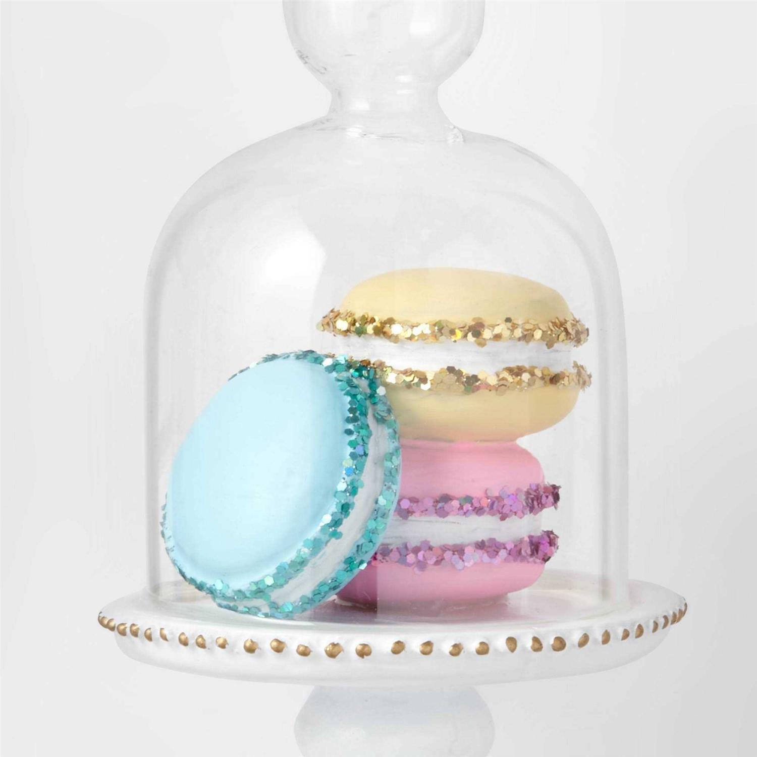 Add a sweet, festive flavor to your holiday tree with this Macaron Glass Christmas Tree Ornament from Wondershop . Made of glass, this decorative ornament showcases macarons in pink, yellow and light blue colors with glitter accents that are displayed on a white cloche cake stand featuring gold highlights. Intended for indoor decorative use, the ornament comes with a top loop for easy hanging from the branches of your tree. Wondershop : Welcome to the Wondershop.